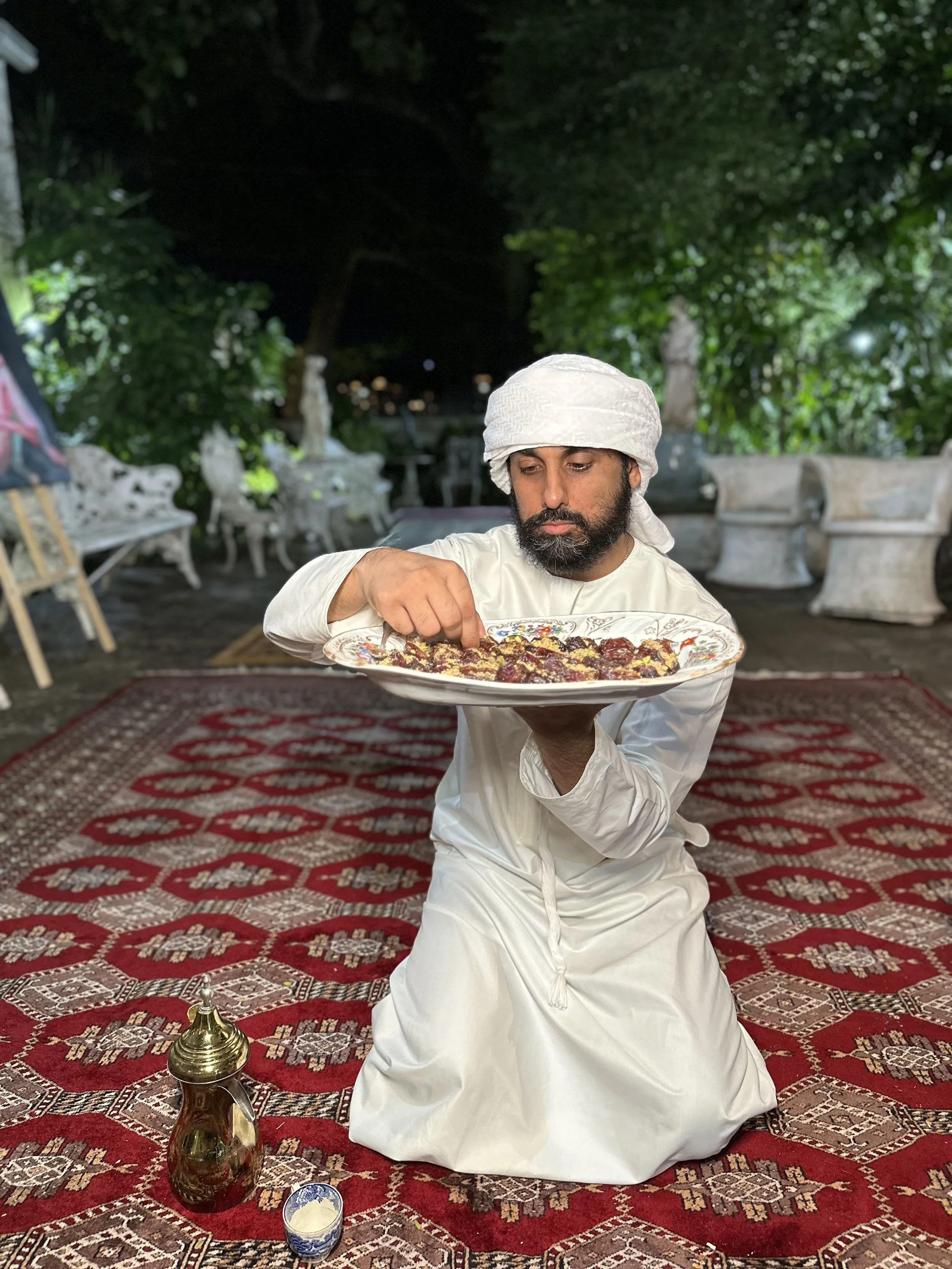 In the true spirit of his ancestors, every guest is welcomed with freshly brewed Arabic coffee, handcrafted tea, sweet dates, and delicate baklava — symbolizing abundance, gratitude, and connection. Each sip and bite tells a story of the desert’s warmth and the tribe’s deep-rooted value of hospitality.